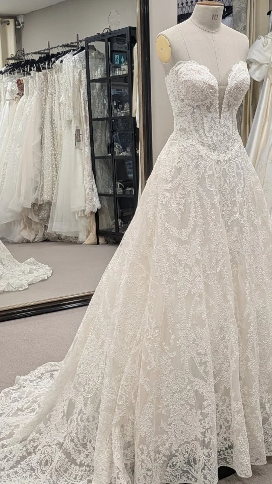 Zarah is a delicately beaded wedding gown with an intricate swirling pattern that emphasizes the figure. The high illusion neckline creates a light semitransparent coverage, revealing a flattering sweetheart neckline beneath. Full length fitted sleeves and a puddle train complete the look.