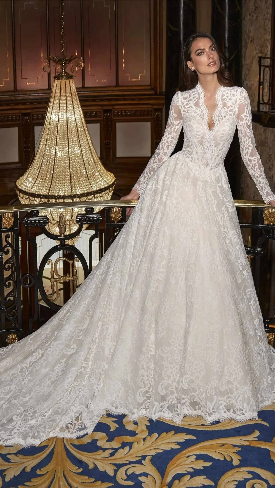 Margot is a spectacular one of a kind wedding gown which combines a classic princess silhouette with a strikingly modern cutout neckline. The full ballgown skirt features flattering pleats that increase the volume, and the fitted bodice flows into a low V back.